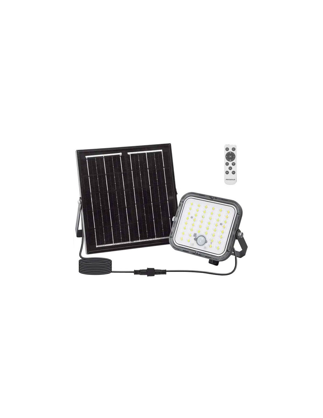 Faro led 80W 800lm 6500°K con sensore di presenza PIR - Pannello solare monoscristallino potenza 5W - Cavo collegamento fra pannello e faro 2m - Batteria da 4Ah 3.4V - Dimensioni faro 15.3x14x3.8cm - Dimensioni pannello 20x21x1.7cm - Entrambi orientabili di 180°
