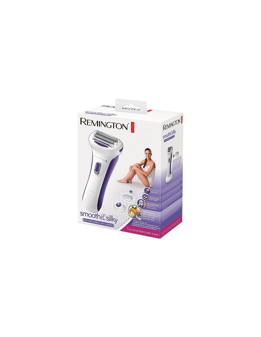 Testina doppia lamina Opti Angle oscillante ipoallergeniche per una rasatura veloce e confortevole - Rifinitore integrato - Presa soft touch - Pettine zona bikini - Resistente all'acqua: utilizzabile su belle asciutta o bagnata anche sotto la doccia - Ricaricabile - Autonomia 40 minuti - Spazzola di pulizia a custodia