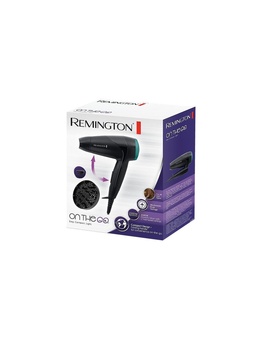 Asciugacapelli da viaggio - Manico pieghevole - 2 temperature/velocità - Doppio voltaggio 120/240V - Potenza 2000W