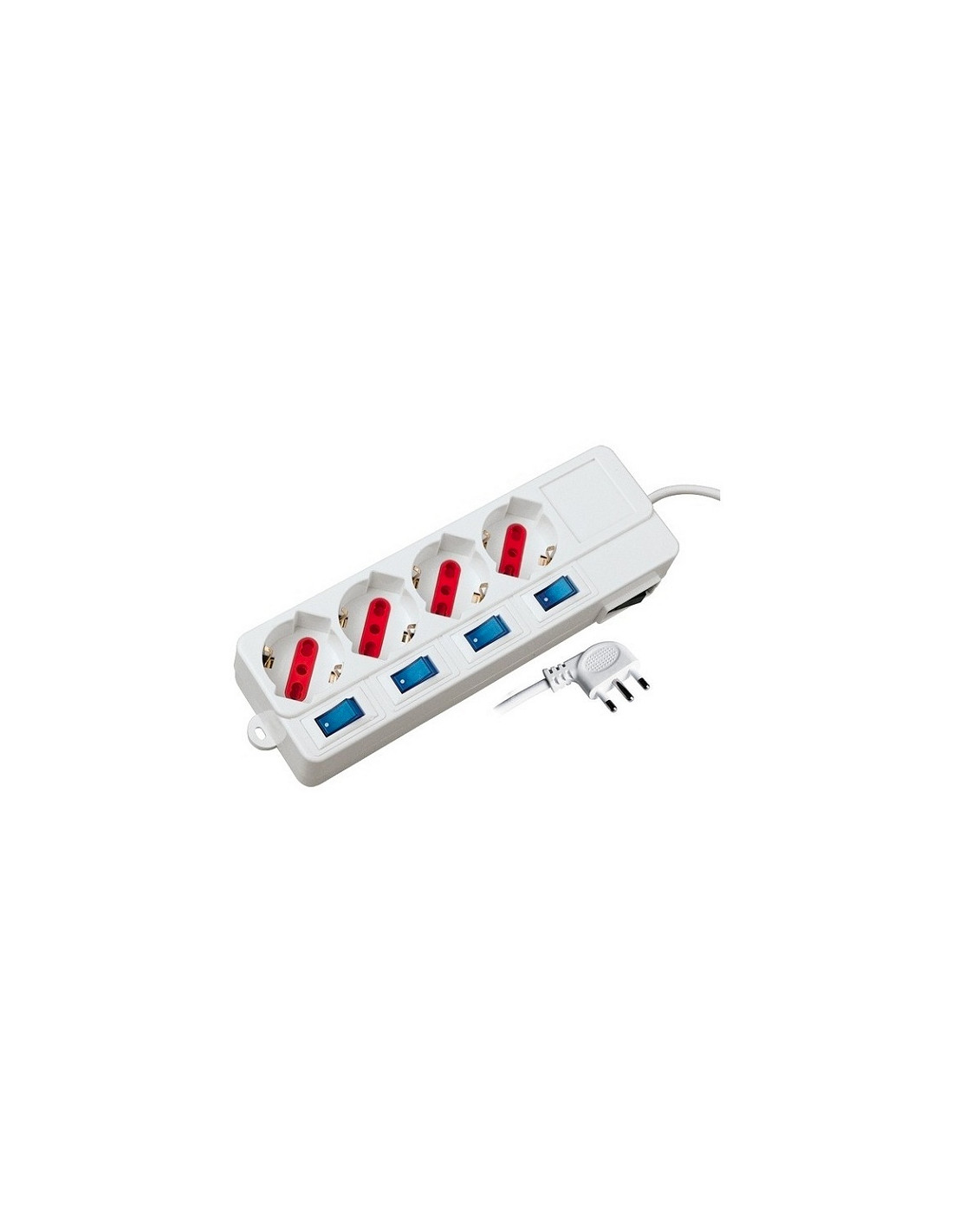 4 posti bipasso 10/16A e schuko - Interruttore luminoso generale con protezione da sovraccarico + 4 interruttori indipendenti - 250V - Max 3500W - Spina salvaspazio a 90° - Cavo H05VV-F 3G1.0mm x 1.5 metri - In tecnopolimero autoestinguente - Alveoli protetti